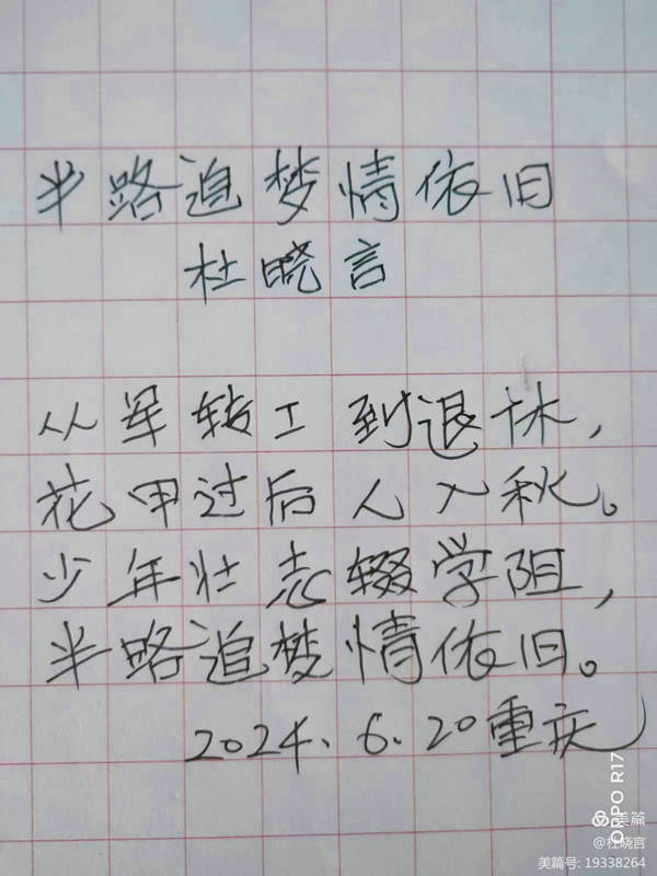 半路追夢情依舊2024-06-18仿宋半路追夢情依舊杜曉言從軍轉(zhuǎn)工到退休,花甲過后人入秋。少年壯志輟學(xué)阻,半路追夢情依舊。重慶...