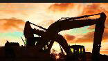 工地塔吊屹立繁華都市藍(lán)天白云襯景綠色環(huán)保工地在夕陽(yáng)下的繁忙...