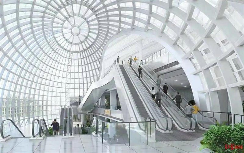 據(jù)介紹,天府站以“筑巢引鳳”為設(shè)計理念,形態(tài)上采用了大量的曲線元素,造型設(shè)計現(xiàn)代新穎,優(yōu)雅連續(xù):鳥瞰效果如振翅欲飛的鳳凰棲停于站場之上;立面以橫向的鋁合金線條突顯建筑的舒展感,端部的綜合換乘大廳——鳳凰之眼和腰部的光谷雨棚成為各自立面的視覺中心。