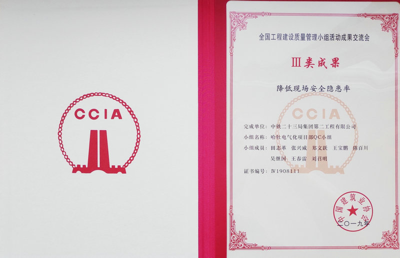 7月12日,從中國建筑業(yè)協(xié)會主辦的2019年全國工程建設(shè)質(zhì)量管理小組活動成果交流會傳來消息,中鐵二十三局集團二公司承建的哈牡電氣化鐵路改造項目,濱綏線K9果園街公鐵立交橋工程QC小組,《降低現(xiàn)場安全隱患率》研究成果獲得三類成果獎。