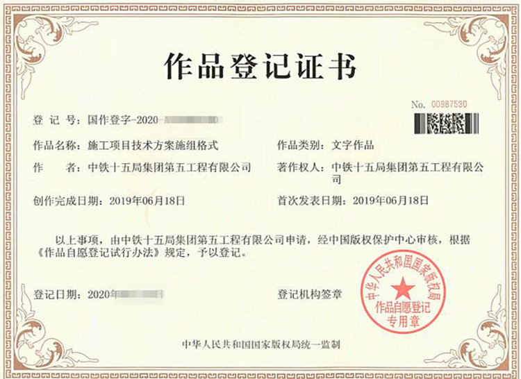 4月15日,中鐵十五局五公司喜獲中華人民共和國國家版權局頒發(fā)的《施工項目技術方案施組格式》作品登記證書,在著作權保護方面取得新進展。
