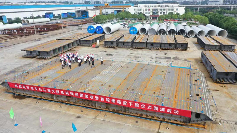 7月3日,隨著現(xiàn)場指揮人員一聲令下,中建安裝集團(tuán)五洲公司(以下簡稱:中建五洲)鋼結(jié)構(gòu)成品車間內(nèi),裝載著重67.6噸、長18米、寬4.1米、高2.5米首輪首節(jié)鋼箱梁的平板車平穩(wěn)駛出總拼車間進(jìn)入涂裝工序,提前50天順利 下胎,標(biāo)志著中建五洲承接的淮安白馬湖大橋建造項目迎來了開門紅。