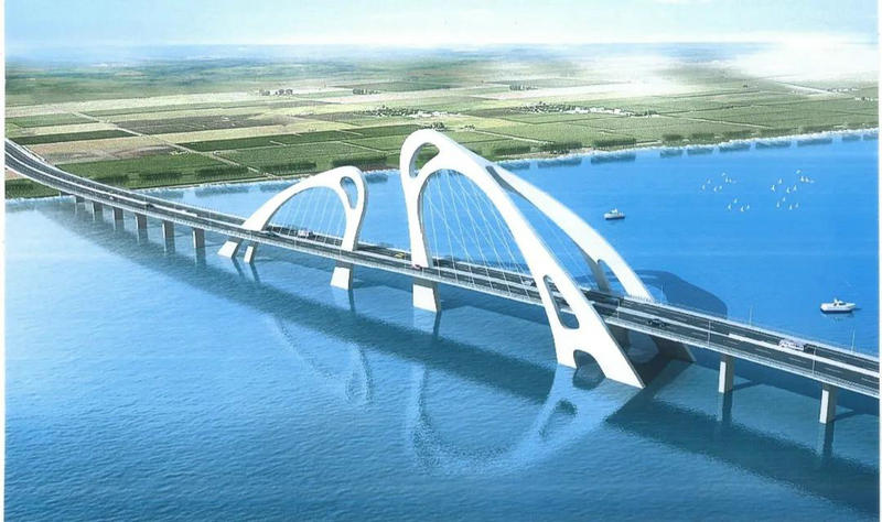 白馬湖大橋位于江蘇省重要生態(tài)保護(hù)和涵養(yǎng)區(qū)——淮安市白馬湖生態(tài)旅游度假區(qū)內(nèi),作為景區(qū)內(nèi)最重要的基礎(chǔ)設(shè)施之一,發(fā)揮著連接湖區(qū)內(nèi)外、串聯(lián)內(nèi)部景點的作用,同時也是淮安未來的地標(biāo)名片。其設(shè)計靈感來源于“魚躍龍門”,一大一小兩座拱塔宛若躍出湖面的白色雙魚,美觀奇特。