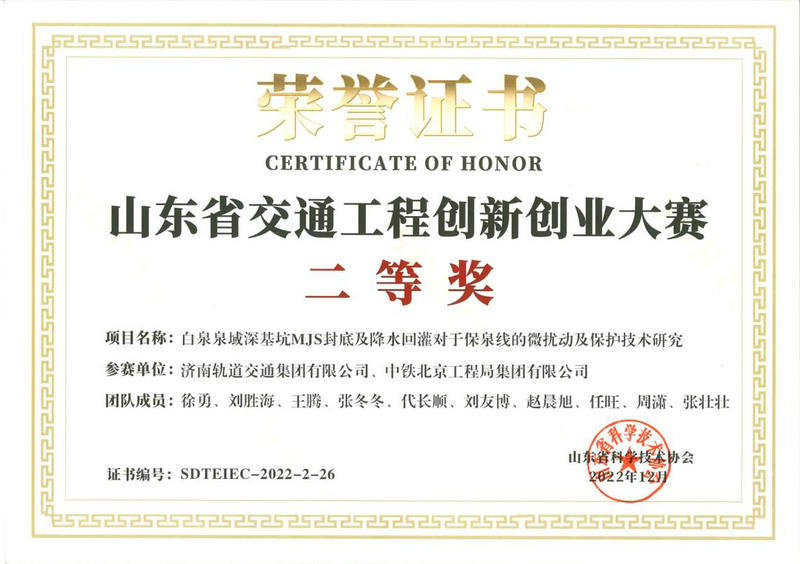 近日,由城軌公司承擔(dān)完成的項目“白泉泉域深基坑MJS封底及降水回灌對保泉線的微擾動及保護技術(shù)研究”成果喜獲山東省科技技術(shù)協(xié)會舉辦的2022年山東省交通工程創(chuàng)新創(chuàng)業(yè)大賽二等獎。