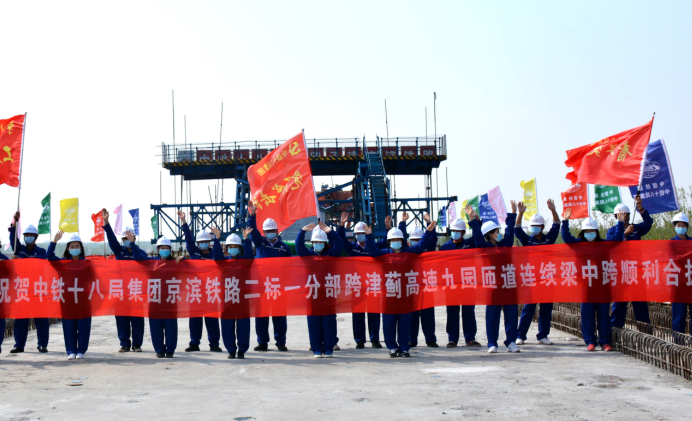 3、4月17日,中鐵十八局集團承建的京濱高鐵北辰特大橋津薊高速九園匝道連續(xù)梁合龍(楊士超 攝)