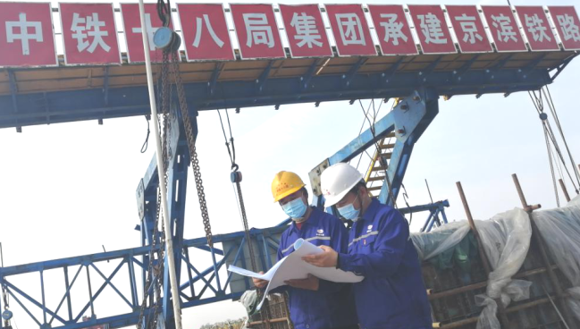 6、4月17日,中鐵十八局集團京濱高鐵二標一分部項目總工張守陸、施工隊負責人吳孝力在研究施工方案(楊士超 攝)
