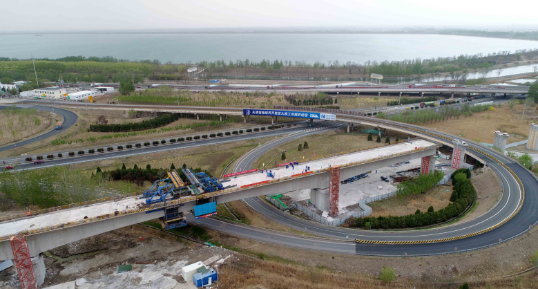 4、4月17日,中鐵十八局集團承建的京濱高鐵北辰特大橋津薊高速九園匝道連續(xù)梁合龍(楊士超 攝)