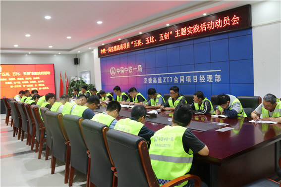 6月1日上午,中鐵一局京德高速ZT7標(biāo)項(xiàng)目召開“五亮五比五創(chuàng)”主題實(shí)踐活動(dòng)動(dòng)員會(huì),項(xiàng)目部領(lǐng)導(dǎo)班子,全體黨員、積極分子、各部門負(fù)責(zé)人參會(huì),活動(dòng)由黨支部專職副書記趙海濤主持。