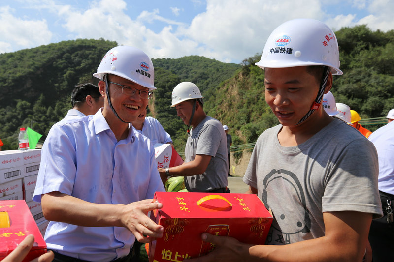 中鐵二十一局三公司副總經(jīng)理、總會(huì)計(jì)師郝敬豪(左)向施工人員發(fā)放慰問品。