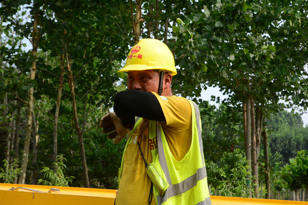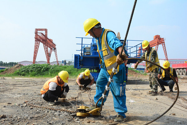 上午7時許,設備拆解現(xiàn)場總指揮柴兵一聲令下,兩臺大噸位吊車緩緩起鉤,提梁機主體拆解工作正式拉開序幕。安全員全程盯控,現(xiàn)場指揮與吊車司機緊密配合,一個小時后1號提梁機機臂成功落地。隨后,工作人員頭頂烈日,開始剛?cè)嵬鹊牟鸾夤ぷ?。來自陜西的年輕工友雷人龍抹了把臉上的汗,瞇著眼睛笑著說道,今天要拆上百條螺栓,手上若不戴上工作手套,掌心就會磨脫皮,兩三個小時就要磨爛一雙新手套。渴了,工人們會到旁邊歇幾分鐘,500毫升一瓶的礦泉水,咕咚咕咚兩口就沒了。