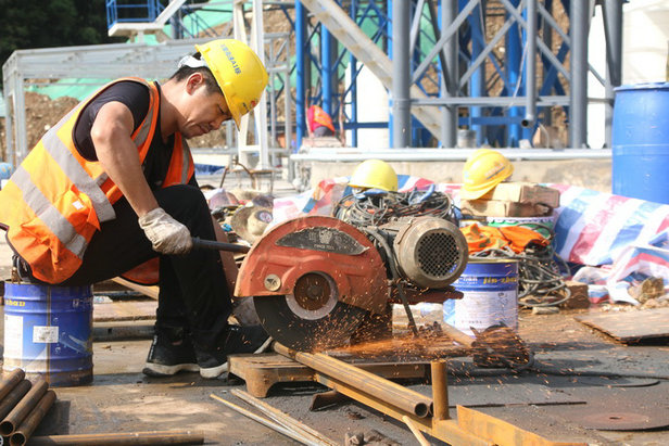 圖為工人切割鋼管攜手共建 發(fā)揮央企優(yōu)勢助力地方發(fā)展