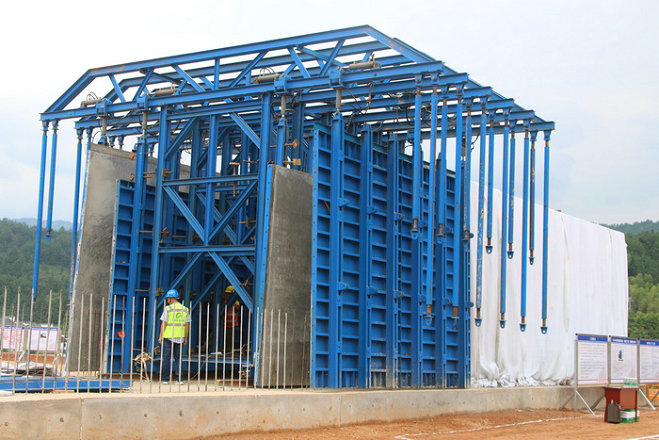 軌行式涵洞液壓模板在進行混凝土澆筑 在K8+000涵洞施工中,他們使用了軌行式涵洞液壓模板。這樣的液壓式模板屬于可以分拆拼裝的整體式模板,不僅移動方便,支模也非常方便,只要把兩側的螺旋式支撐腿固定在模板上,即可進行混凝土澆筑施工。使用軌行式涵洞液壓模板,施工質量有了保障,不會發(fā)生漏漿跑模,也保證了振搗效果,工程質量得到了保證。