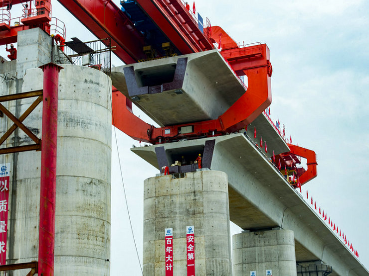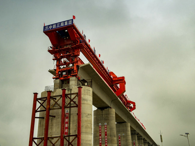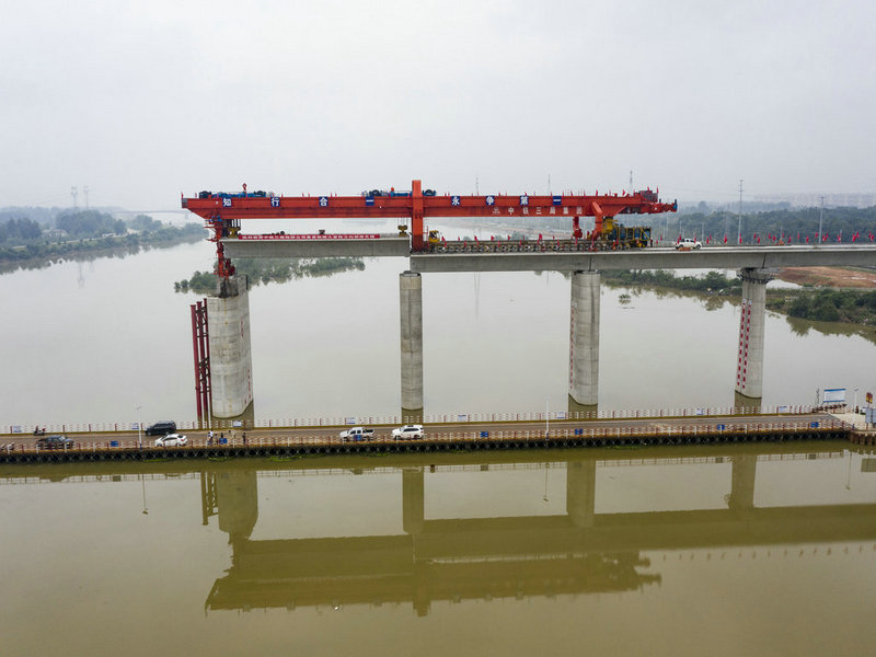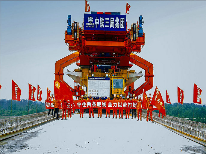 (黃黃鐵路2標(biāo)大里程蘄河特大橋最后一片第233孔箱梁架設(shè)現(xiàn)場(chǎng))