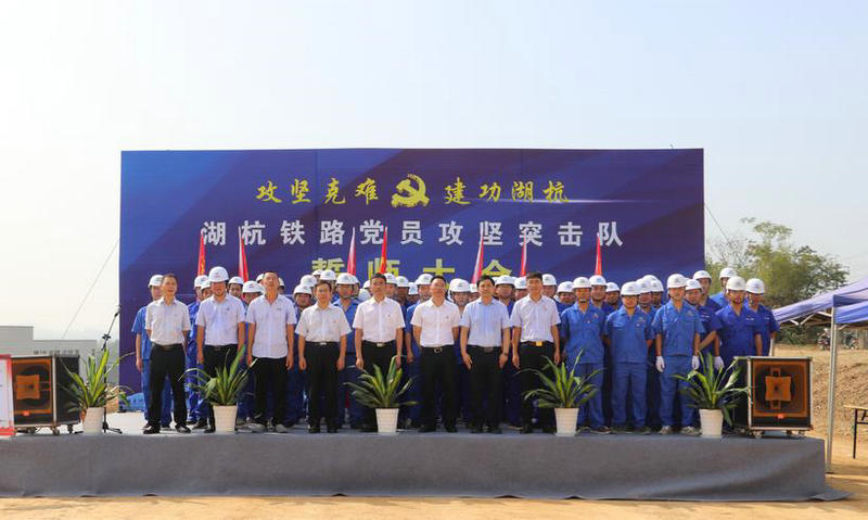 活動(dòng)上,中鐵十一局集團(tuán)有限公司湖杭鐵路項(xiàng)目經(jīng)理羅建軍提出,舉行“攻堅(jiān)克難,建功湖杭”黨員攻堅(jiān)突擊隊(duì)誓師大會(huì),目的只有一個(gè),就是以此為起點(diǎn),向著我們湖杭項(xiàng)目的五項(xiàng)重點(diǎn)卡控工程發(fā)起攻堅(jiān)沖鋒,現(xiàn)在已經(jīng)到了決戰(zhàn)決勝的關(guān)鍵時(shí)刻。他強(qiáng)調(diào),要認(rèn)清形勢(shì),再鼓干勁,迅速掀起攻堅(jiān)突擊高潮。項(xiàng)目部要積極配合各黨員攻堅(jiān)突擊隊(duì),超前做好施工準(zhǔn)備工作,有效投入精力,優(yōu)化施工方案,合理調(diào)配人員、設(shè)備和物資材料,保障五項(xiàng)重點(diǎn)卡控工程現(xiàn)場(chǎng)的有序施工。今年是習(xí)總書記提出“兩山”理論的十五周年,項(xiàng)目各級(jí),特別是擔(dān)負(fù)具體任務(wù)的各黨員攻堅(jiān)突擊隊(duì),一定要正確處理好生態(tài)環(huán)境與工期效益的關(guān)系,力求在不損害生態(tài)環(huán)境的前提下合理推進(jìn)施工進(jìn)度,確保“兩手抓、兩手贏”。