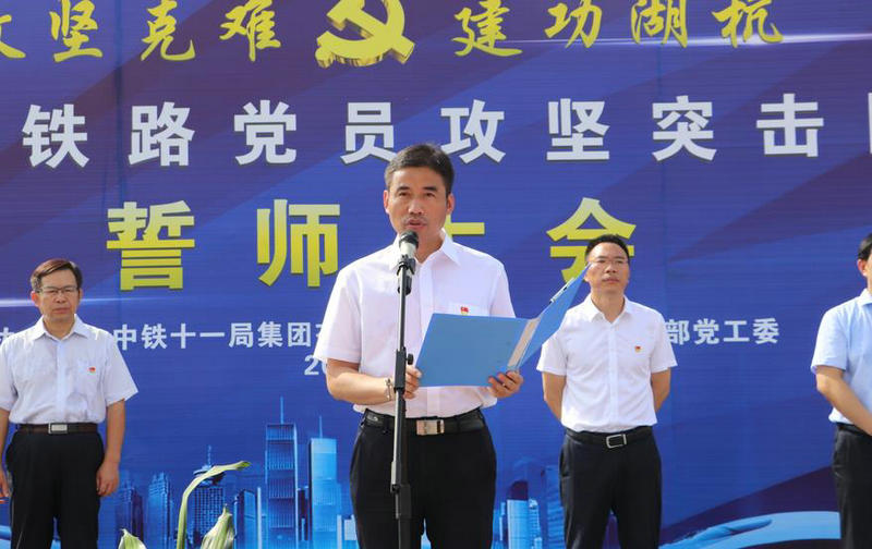 伴隨著現(xiàn)場(chǎng)突擊隊(duì)的聲聲誓言,8月20日上午,“攻堅(jiān)克難,建功湖杭”湖杭鐵路黨員攻堅(jiān)突擊隊(duì)誓師大會(huì)在中鐵十一局集團(tuán)有限公司湖杭鐵路項(xiàng)目龍崗寺大橋區(qū)間路基施工現(xiàn)場(chǎng)舉行。滬昆客專浙江公司,湖杭鐵路有限公司,中鐵十一局集團(tuán)有限公司等有關(guān)領(lǐng)導(dǎo)出席。