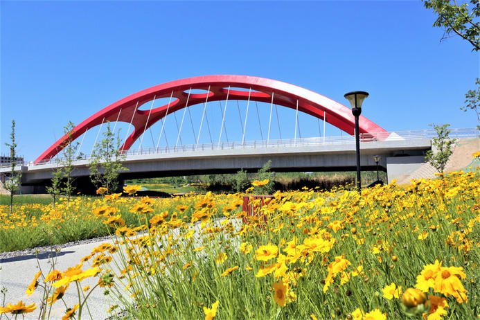 由中鐵廣州局市政環(huán)保公司承建,位于陜西西咸新區(qū)灃西新城中部浪漫新地標豐耘橋,如一道靚麗的彩虹,飛架于風景秀麗的中心綠廊濕地公園之上。豐耘橋是一座紅色拱橋,象征著愛情的熱烈,橋體全長約399米,為提籃式系桿拱橋設計,完美的流線設計,寓意愛情長長久久、順順利利,與心愛的人攜手走到豐耘橋上,感受漫地花海的圍繞,只會想到愛情的甜蜜,會更加深愛對方,這將會是愛情中一次浪漫的經(jīng)歷,只有攜手共同走過、經(jīng)歷過,愛才會越濃烈,經(jīng)歷了酸甜苦辣,真愛才會更加長久