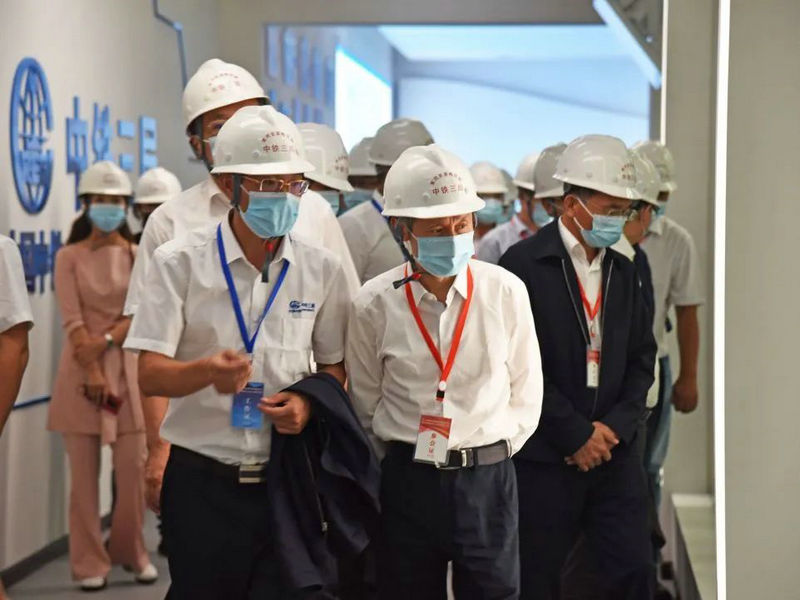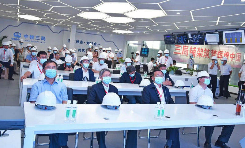 中國(guó)中鐵總工程師孔遁(左二)、中國(guó)中鐵高級(jí)專家朱本珍(左一)、中鐵三局總經(jīng)理李新遠(yuǎn)(左三)在智控中心