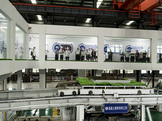 觀摩團(tuán)一行人觀光通道參觀車間自動(dòng)化軌枕生產(chǎn)線