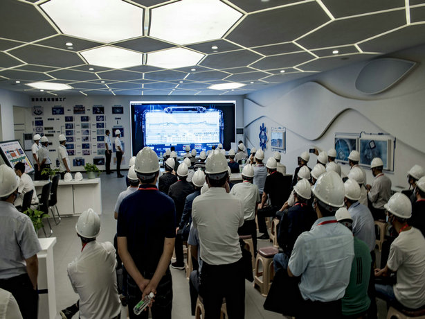 觀摩團(tuán)一行在中控室觀看軌枕宣傳片