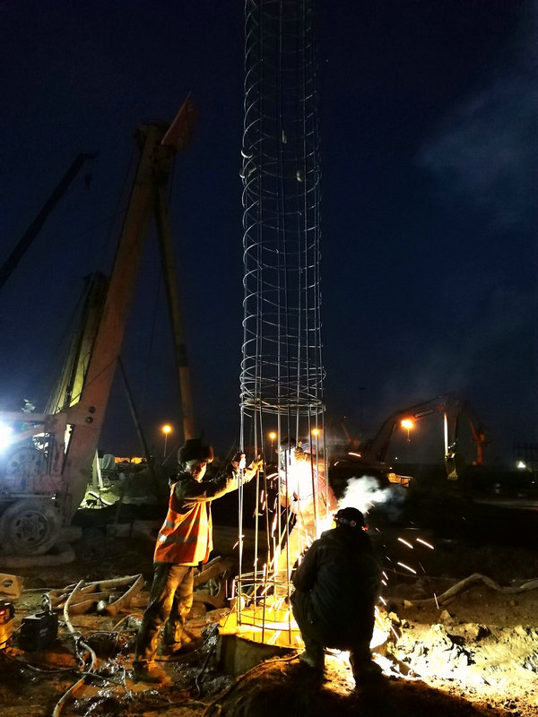 回想起解決混凝土問題的艱辛,工程部長楊旋感慨地說:“我們?nèi)f(xié)調(diào)的時候,商混站負責(zé)人也給我們表明了低溫環(huán)境下生產(chǎn)混凝土面臨的困難,設(shè)備不敢用手直接碰觸,否則就會被金屬粘結(jié)住,造成凍傷,困難確實不小,但想到已經(jīng)成孔的樁位如果不及時澆筑混凝土,時間久了必定會塌孔,那樣損失就大了,所以我們沒有退路,只能想辦法解決問題”。