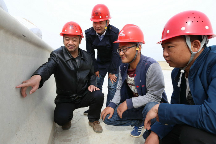 項目書記于喜田(左一)、副經(jīng)理楊軍(左二)、工程部長楊林(右一)、一工區(qū)經(jīng)理王彥彥(右二)在檢查防撞墻質(zhì)量。