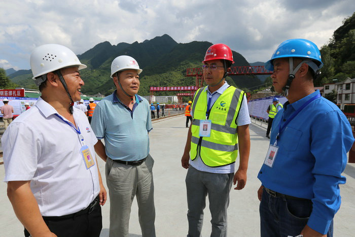 圖為參加現(xiàn)場觀摩的公司副總經(jīng)理雷榮仁(左二)、項目經(jīng)理王亞輝(左一)與管理處安質(zhì)科科長李善群(右二)、總監(jiān)辦總監(jiān)馮五一(右一)在制梁場交談