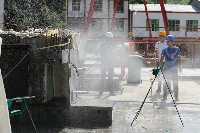 在參觀制梁施工中,盡管氣溫很高,曬得人汗流浹背,但觀摩人員卻忘情投入,看的十分仔細(xì)。干凈整潔,規(guī)模宏大的現(xiàn)代化制梁場令人耳目一新。在鋼筋綁扎機(jī)現(xiàn)場,很多觀摩人員親自體驗。在噴淋養(yǎng)生系統(tǒng)、梁場鋼筋安裝移動推拉式遮雨棚、梁板濕接縫、端頭橫梁接頭手持式混凝土鑿毛機(jī)操作現(xiàn)場,觀摩人員不停詢問,副經(jīng)理暴林一一作答。很多人拿出手機(jī)拍照錄相,記錄制梁施工過程。當(dāng)記者問18標(biāo)江西路橋常務(wù)副經(jīng)理張小剛的觀摩感受,他說:“17標(biāo)制梁場規(guī)模宏大,工藝先進(jìn)、設(shè)備先進(jìn),這才是真正的標(biāo)準(zhǔn)化施工,看了令人震撼。中鐵二十一局三公司是央企,我們沒法比啊。”旁邊一位帥氣的監(jiān)理接過話說:“那你們要加油??!”