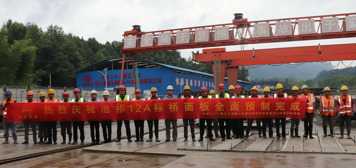 自去年10月份首件鋼板組合梁橋面板施工以來(lái),項(xiàng)目部工程技術(shù)人員,堅(jiān)持盯控現(xiàn)場(chǎng),嚴(yán)把施工質(zhì)量,對(duì)每一片都做好安全質(zhì)量技術(shù)交底,施工過(guò)程記錄在案,以便質(zhì)量跟蹤追溯。在吊裝運(yùn)輸過(guò)程中,現(xiàn)場(chǎng)安全員、值班技術(shù)人員始終跟班作業(yè),周密組織、協(xié)調(diào)指揮。同時(shí)為加快推進(jìn)節(jié)點(diǎn)進(jìn)度,確保工程質(zhì)量,對(duì)現(xiàn)場(chǎng)作業(yè)人員進(jìn)行安全質(zhì)量技術(shù)專(zhuān)業(yè)培訓(xùn),組建專(zhuān)業(yè)化施工隊(duì)伍,持證上崗,施工作業(yè)人員戰(zhàn)高溫、輪班倒,小雨不停歇,經(jīng)過(guò)全體參建人員的共同努力,高效率圓滿(mǎn)完成預(yù)制任務(wù)。在慶祝鋼板組合梁橋面板預(yù)制完成儀式上,駐地辦高監(jiān)謝曉飛等監(jiān)理人員前來(lái)現(xiàn)場(chǎng)表示祝賀,對(duì)池祁12A標(biāo)取得階段性成績(jī)表示肯定,并對(duì)橋面系后續(xù)施工提出了相關(guān)要求。