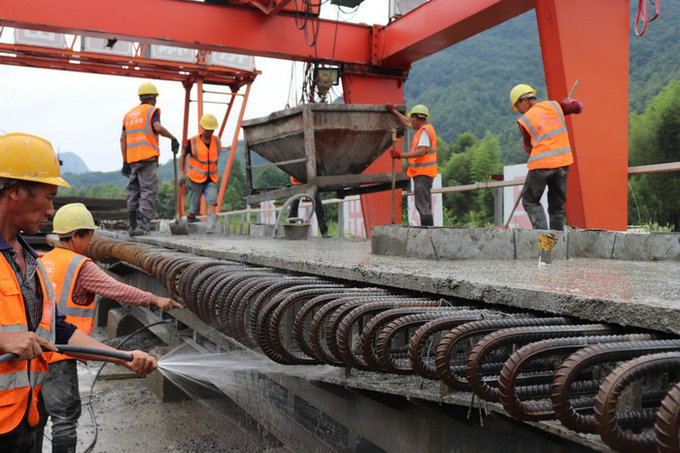 圖為員工慶祝鋼板組合梁橋面板預(yù)制完成 施工過(guò)程中,由于現(xiàn)場(chǎng)施工質(zhì)量受操作人員技術(shù)素質(zhì)影響大,而且受中孔道壓漿質(zhì)量難以檢查和控制等因素制約,為有效解決施工難點(diǎn),施工中將標(biāo)準(zhǔn)化、規(guī)范化貫穿全過(guò)程,嚴(yán)把施工工藝和工序及原材料質(zhì)量關(guān),不斷優(yōu)化施工組織,強(qiáng)化砼配合比試驗(yàn)控制,采集最佳數(shù)據(jù),利用蒸汽養(yǎng)生,有效提高了工程質(zhì)量,張拉和震搗中堅(jiān)持專(zhuān)人負(fù)責(zé)、專(zhuān)人控制,減少人為因素導(dǎo)致的差異,確保了砼質(zhì)量穩(wěn)定,大大提高了成品率。