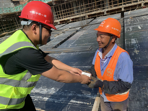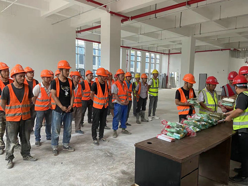 管理人員為外協(xié)隊(duì)伍工人發(fā)放防暑物品