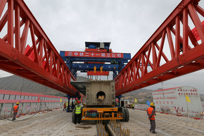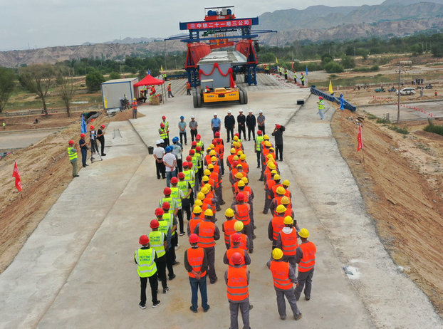 圖為架梁儀式現(xiàn)場 據(jù)項(xiàng)目部總工王雷星、工程部長李小偉介紹,洮河大橋全長888米,左右幅由17跨50米長的波紋鋼腹板鋼混組合梁跨越洮河,每跨架設(shè)兩片梁??缍冗_(dá)50米的波紋鋼腹板鋼混組合梁,在甘肅省是最長的,在中鐵二十一局也是首次施工。