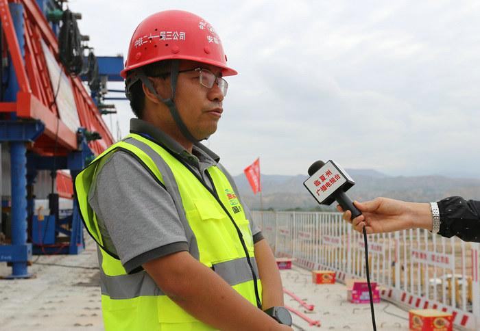 圖為項(xiàng)目經(jīng)理許道連接受臨夏州電視臺記者采訪