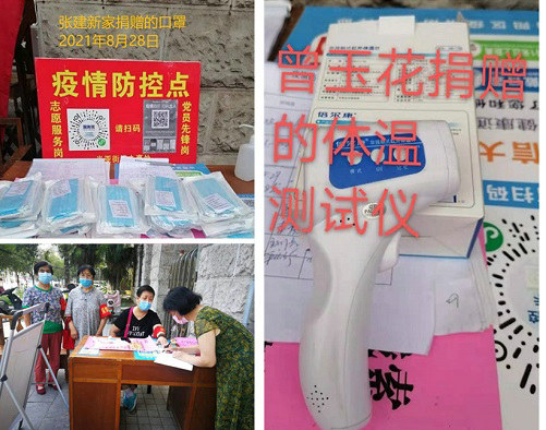 2021年8月28日上午,在大院北大門疫情防控值班卡點現(xiàn)場,我們大院一號樓老住戶,公司新疆項目部副經(jīng)理張建新同志與他媽媽一起,手里提著一大塑料袋口罩,一邊往值班桌上放,一邊真情地對正在值班人員說:“我媽年齡大了不能來值班,我又在下面項目部工作,也沒時間來大門口的疫情防控點參加輪流值班,只好向每天在此辛苦值班人員捐送三百個口罩,略表我們的心意,同時愿疫情早日勝利結(jié)束”。在設(shè)立疫情卡點之初,原公司工會女工部長曾玉花同志,積極來參與值班的同時向值班卡點捐贈了體溫檢測儀。