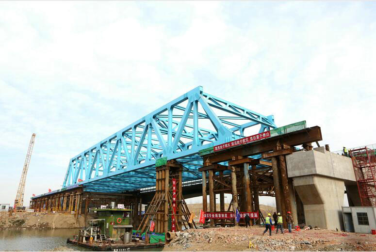 中鐵一局首次——京滬高速公路改擴(kuò)建項(xiàng)目跨鹽河95米鋼桁梁采用浮托法架設(shè)順利完成