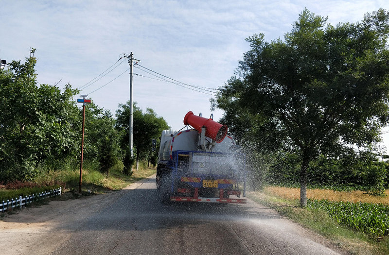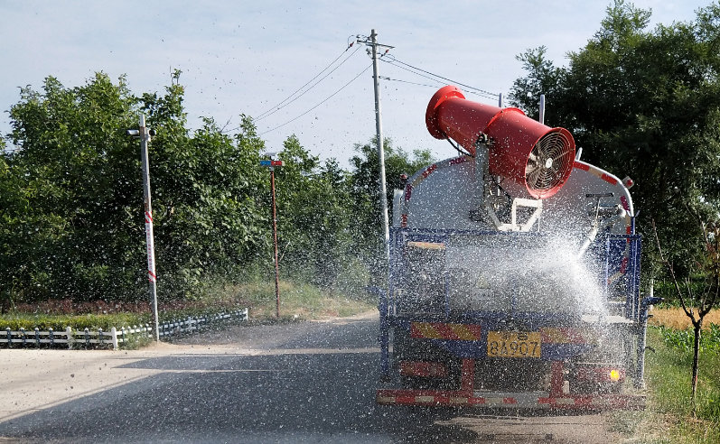 這輛車(chē)就是項(xiàng)目部購(gòu)買(mǎi)的“霧霾克星”多功能抑塵灑水車(chē),因外形神似“大炮”,有人也稱(chēng)之為“霧炮車(chē)”。“這兩輛灑水車(chē)罐內(nèi)能裝10噸自來(lái)水,經(jīng)高壓管路送至高壓噴嘴霧化,形成飄飛的水霧,能夠吸附空氣中的灰塵。咱們抑塵車(chē)的抑塵高度遠(yuǎn)程都能達(dá)到幾十米,能有效的降低粉塵和霧粒。”