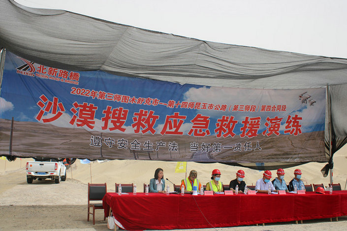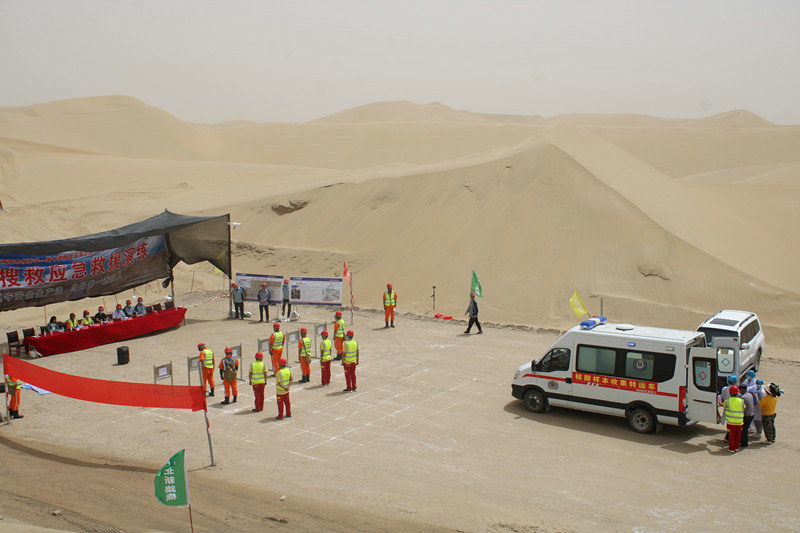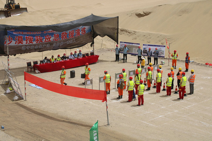 為給沙漠人員走失及高溫中暑情況下夯實基礎,沙漠施工作業(yè)開個好頭,北新路橋圖昆公路項目第四標段管理團隊與第三師建設項目建管處緊密配合,在演練程序和細節(jié)上作了周密規(guī)劃和籌備。