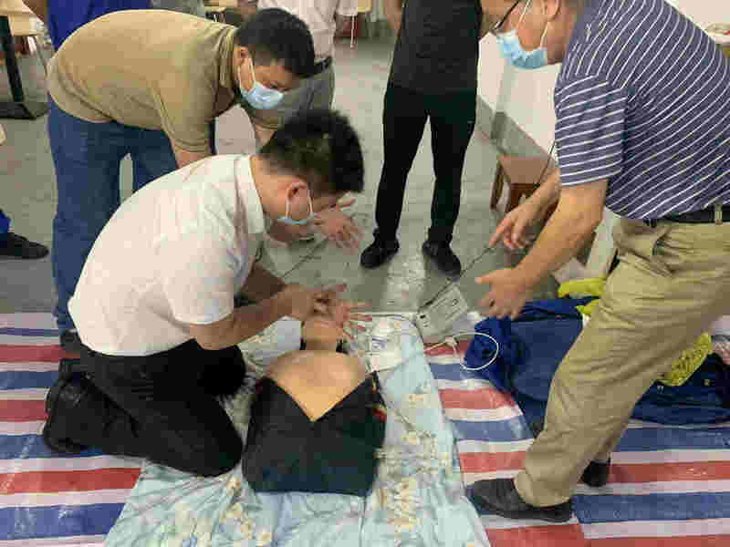 培訓特邀廣東省第二人民醫(yī)院專家到場授課,通過PPT演示,詳細講解了如何判斷被救者心跳呼吸停止、心肺復蘇指征、心肺復蘇操作步驟、復蘇成功指征等專業(yè)知識,并親自示范了從評估現(xiàn)場環(huán)境、判斷被救者狀態(tài)、清理口中異物及開展正確的按壓施救等各個環(huán)節(jié)。在專家演示完后,項目員工、業(yè)主及監(jiān)理人員也借助模擬人等教具進行實操,學習了急救手法,同時專家也及時糾正了大家的錯誤與不足。經(jīng)過了兩個多小時的現(xiàn)場演練互動,逐步掌握自救和互救技能,具備了一定的應對心臟驟停的處理能力。
