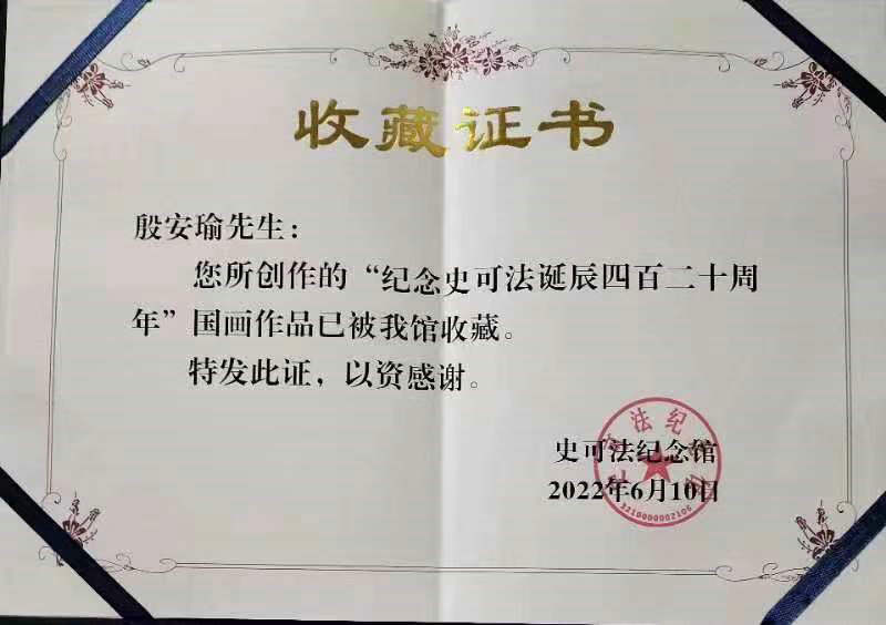 ——今年是民族英雄史可法誕辰420周年。史可法與岳飛、文天祥齊民的民族英雄。他為捍衛(wèi)民族尊嚴,浴血奮戰(zhàn),舍身忘死,他的事跡動天地,泣鬼神是江蘇揚州這座城市豐碑和英雄底色。由揚州市文化廣電和旅游局、揚州市文聯(lián),江蘇史可法紀念館,揚州市美術家協(xié)會、揚州書法家協(xié)會共同舉辦的紀念史可法誕辰420周年書畫作品征集活動,我的國畫作品獲獎,并被史可法紀念館永久收藏!