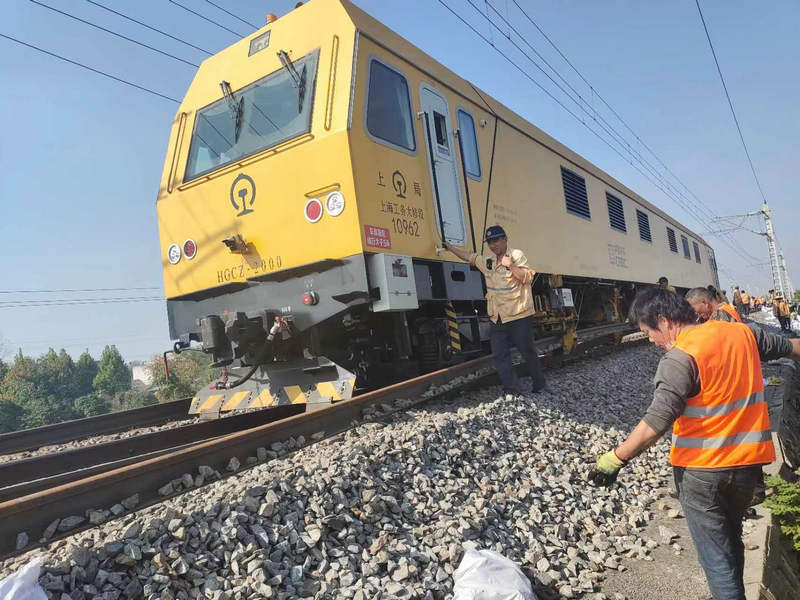 “師傅,這里連續(xù)有幾塊膠墊偏斜,請一會整好。在那邊有兩個螺絲扭力矩不到位,我在枕木面做了標(biāo)記等會兒去復(fù)擰一下……”10月21日,在京九下行線K790+520公里處,中國鐵路上海局集團有限公司阜陽工務(wù)段亳州線路車間王寨示范隊職工胡天賜監(jiān)控大列換軌質(zhì)量,發(fā)現(xiàn)連續(xù)幾塊膠墊歪斜及扣件扭力矩等問題,立即通知施工人員進(jìn)行整改。