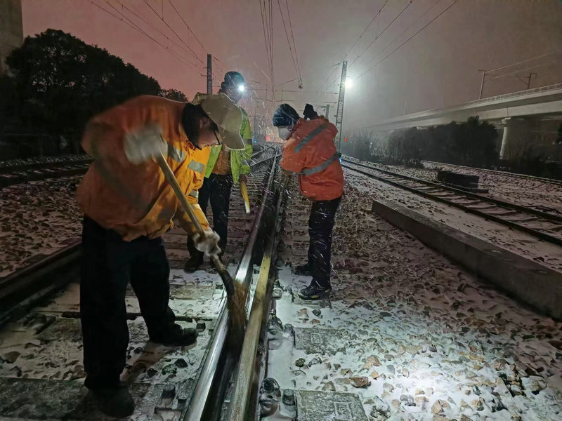 1月14日,皖西北地區(qū)迎來降溫、降雪過程,中國鐵路上海局集團有限公司阜陽工務段亳州線路車間為確保京九線列車運行安全暢通,自14日晚上到15日早上組織人員對各站場道岔進行掃雪、除凍。