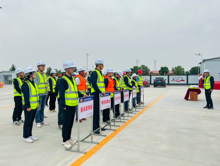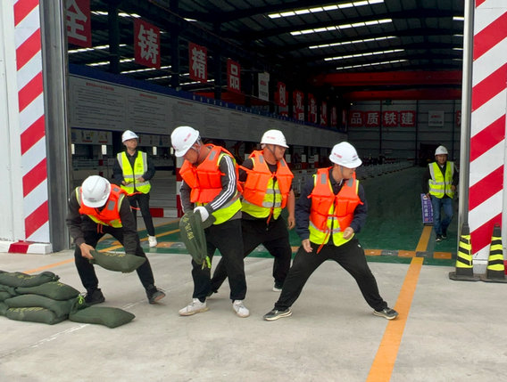 此次演練模擬河北省滄州市海興縣突遭暴雨襲擊,項(xiàng)目2號(hào)鋼筋加工場(chǎng)水位急速上漲,重要物資設(shè)備和作業(yè)人員遭遇險(xiǎn)情,急需轉(zhuǎn)移。分部安全管理部部長(zhǎng)、防洪搶險(xiǎn)監(jiān)測(cè)預(yù)警組組長(zhǎng)張海嬌發(fā)現(xiàn)汛情后,立即向分部負(fù)責(zé)人、應(yīng)急救援總指揮宋延濤報(bào)告??傊笓]隨即下達(dá)命令,立即啟動(dòng)防汛搶險(xiǎn)應(yīng)急預(yù)案。監(jiān)測(cè)預(yù)警組、應(yīng)急搶險(xiǎn)組、醫(yī)療救護(hù)組、物資后勤組、通訊聯(lián)絡(luò)組、保衛(wèi)疏散組等6個(gè)小組的應(yīng)急搶險(xiǎn)人員迅速趕赴現(xiàn)場(chǎng),展開搶險(xiǎn)救援。裝填、運(yùn)輸沙袋筑防水壩,接水管、安裝水泵抽排水,對(duì)受傷人員進(jìn)行急救并轉(zhuǎn)移至安全地帶或醫(yī)院,對(duì)危險(xiǎn)區(qū)進(jìn)行警戒,維持交通秩序等應(yīng)急處置工作緊張有序進(jìn)行……現(xiàn)場(chǎng)情景模擬真實(shí),應(yīng)急搶險(xiǎn)救援緊張有序,活動(dòng)取得圓滿成功。