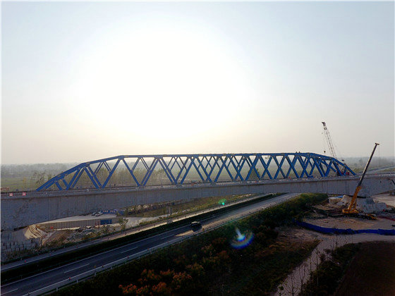 當(dāng)天,在鄭阜鐵路跨寧洛高速連續(xù)梁鋼桁梁拼裝施工現(xiàn)場(chǎng),遠(yuǎn)遠(yuǎn)就能看見(jiàn)一排高聳田間的高架橋,早已成為沃野間一道壯麗風(fēng)景線。眺望大橋,宛如一條藍(lán)色巨龍,橫貫G36寧洛高速,為豫東門戶再添新的靚麗風(fēng)景,橋下依然滿是川流不息的來(lái)往車輛,看似“親密”但又互不影響。