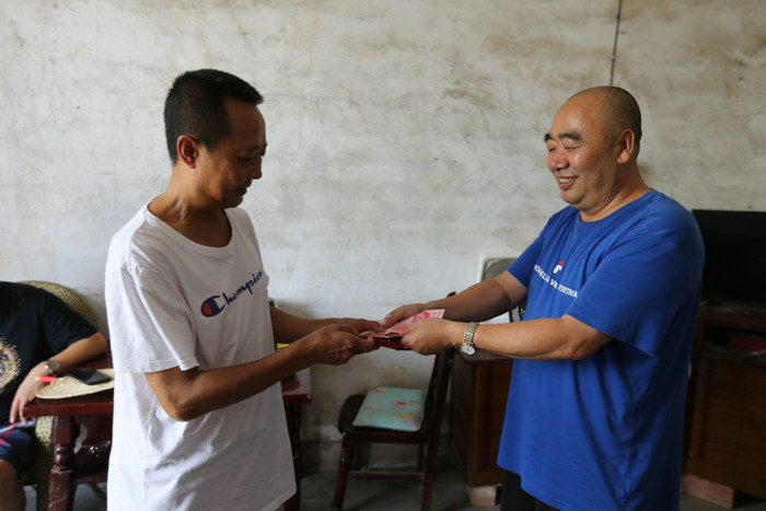 圖為會長李偵榮(右)慰問朱世文 朱世文的家位于鄉(xiāng)村公路旁邊,需要上一個20多米長的陡坡才能進入院落,抬頭一看,雖然房屋是一樓一底的小青瓦房,但墻壁剝落,十分簡陋,除了墻上掛的一臺20英寸的小電視外,屋內沒有一件象樣的家具。據(jù)朱世文介紹,這小青瓦房屋建于1997年,到現(xiàn)在已是破敗不堪。