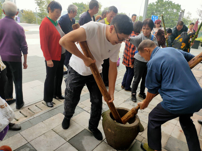 當(dāng)天下午16:00-18:00物業(yè)公司在五街區(qū)廣場提供了兩個(gè)碓窩、2盤熟糯米,并邀請業(yè)主一起開展自助的“趣味打糍粑活動”,體驗(yàn)和感受中秋佳節(jié)深厚的文化底蘊(yùn),和睦鄰里情。