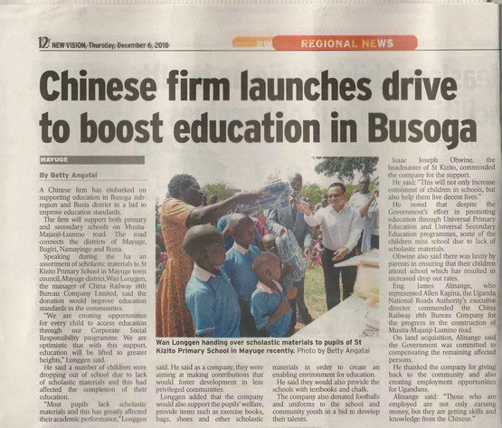 中國(guó)鐵路工程建設(shè)網(wǎng)天津訊(孫太東 劉士敏 報(bào)道)近日,烏干達(dá)最大報(bào)社《NEW VISION》新聞報(bào)道了十八局馬達(dá)加斯加公司烏干達(dá)項(xiàng)目部向當(dāng)?shù)匾患倚W(xué)捐贈(zèng)學(xué)習(xí)用品的愛(ài)心活動(dòng)。標(biāo)題的新聞是《中國(guó)公司在布索加發(fā)起了促進(jìn)教育的運(yùn)動(dòng)》,報(bào)道詳細(xì)地介紹了十八局烏干達(dá)項(xiàng)目部捐贈(zèng)情況,并配發(fā)了活動(dòng)照片。十八局主動(dòng)融入當(dāng)?shù)厣鐣?huì),積極履行社會(huì)責(zé)任,與當(dāng)?shù)毓蚕砗献靼l(fā)展成果,贏得了當(dāng)?shù)卣腿嗣竦膹V泛贊譽(yù)。