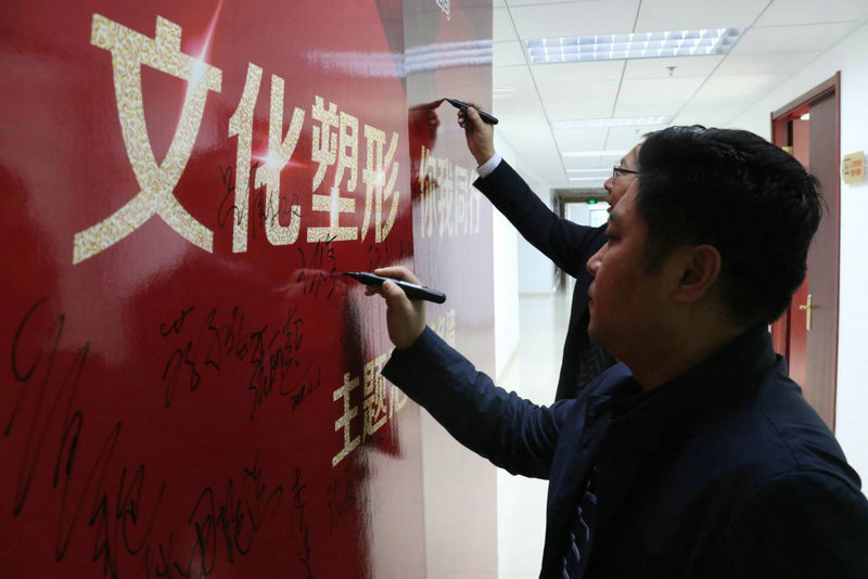本期道德講堂設(shè)有主題簽名、看宣傳片、唱歌曲、講故事、誦經(jīng)典、送吉祥六個環(huán)節(jié)。下午13時(shí),參加活動的職工陸續(xù)來到簽名墻前,用筆簽下了自己的一份承諾,拉開了活動的序幕。