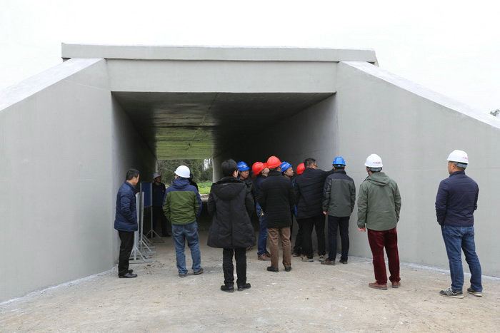 督查組人員查看涵洞八字墻 涵洞施工是DDTJ1標(biāo)項目部的一大亮點,全線共有涵洞107座,目前已完工50座。這些涵洞的特點全部為現(xiàn)澆,交通排水功能皆具,空間尺寸大,長度達(dá)數(shù)十米,涵洞墻身及蓋板光滑,清水混凝土顏色十分耐看,幾何線型尺寸美觀。督查組人員聚集在洞口觀看,有的還不時用手觸摸墻身,甚至走進(jìn)涵洞內(nèi),督查組在贊嘆工程質(zhì)量的同時,還不忘“挑刺”。如用剩的油氈沒有及時收走,臺背回填不及時等。中國鐵建投資集團(tuán)德都高速公路責(zé)任有限公司的領(lǐng)導(dǎo),希望德都一標(biāo)項目部繼續(xù)扮演好全線領(lǐng)頭羊的角色,在工程質(zhì)量,安全進(jìn)度方面成為全線的標(biāo)桿。針對督查組提出的問題,經(jīng)理楊斌立即安排工區(qū)進(jìn)行整改。