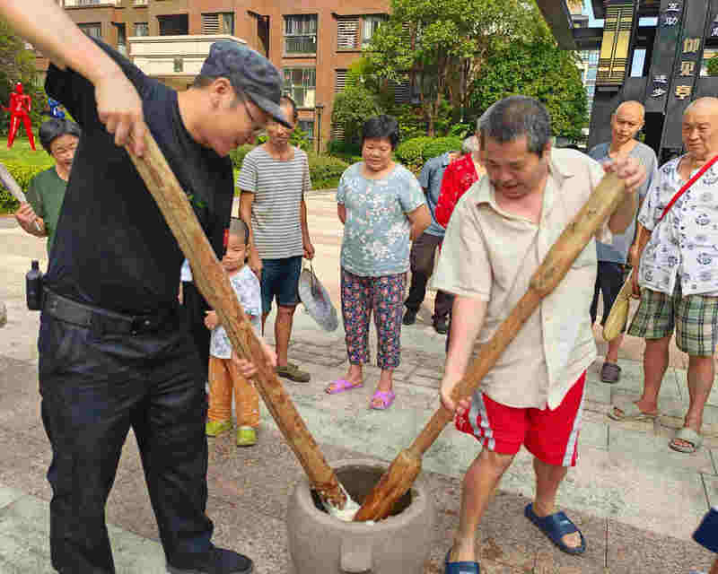 同時,二街區(qū)中庭外舂糍粑活動也同步開始,業(yè)主們把自己蒸好的糯米倒進物業(yè)準(zhǔn)備的碓窩里,業(yè)主兩兩一組,手持木錘有序進行打糍粑,不到一會兒,在大家的齊心合作下,碓窩中的糯米就變成了香甜的糍粑,大家伙兒吃著舂好的糍粑有說有笑,其樂融融,更將節(jié)日氣氛推向高潮。
