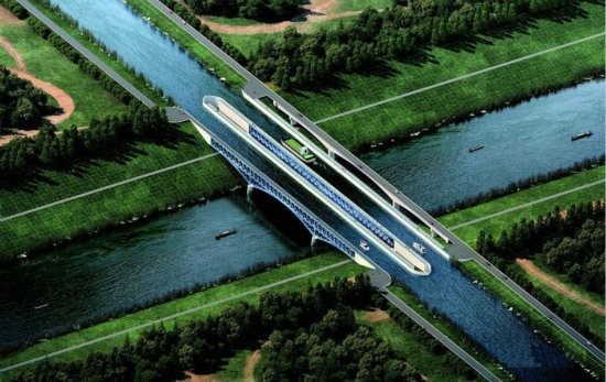 目前,世界最大的渡槽是德國(guó)的馬格德堡渡槽,馬格德堡渡槽采用57.1米+106.2米+57.1米=220.4米的三跨等高度連續(xù)鋼桁架梁橋。J008-2標(biāo)段內(nèi)的淠河總干渠渡槽采用68米+110米+68米=246米的三跨變桁高拱桁組合式橋梁,主跨110米,是擬建的世界上最大的渡槽水橋。