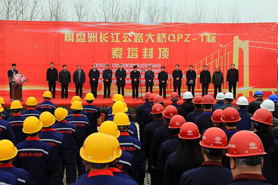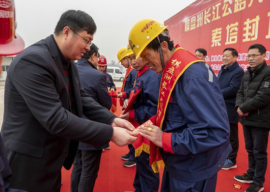 儀式上,蘄春縣人民政府副縣長李國忠致辭;湖北棋盤洲長江公路大橋有限公司副總經(jīng)理、總工程師趙文藝致辭,中鐵建大橋工程局集團(tuán)一公司執(zhí)行董事、黨委書記王學(xué)民致辭;蘄春縣政協(xié)主席蔡緒銀、湖北棋盤洲長江公路大橋有限公司副總經(jīng)理汪應(yīng)軍、中鐵建大橋工程局集團(tuán)橋梁指揮部副指揮張耀為3名“最美工匠”頒獎(jiǎng);湖北棋盤洲長江公路大橋有限公司董事長、總經(jīng)理汪西華宣布北索塔最后封頂。